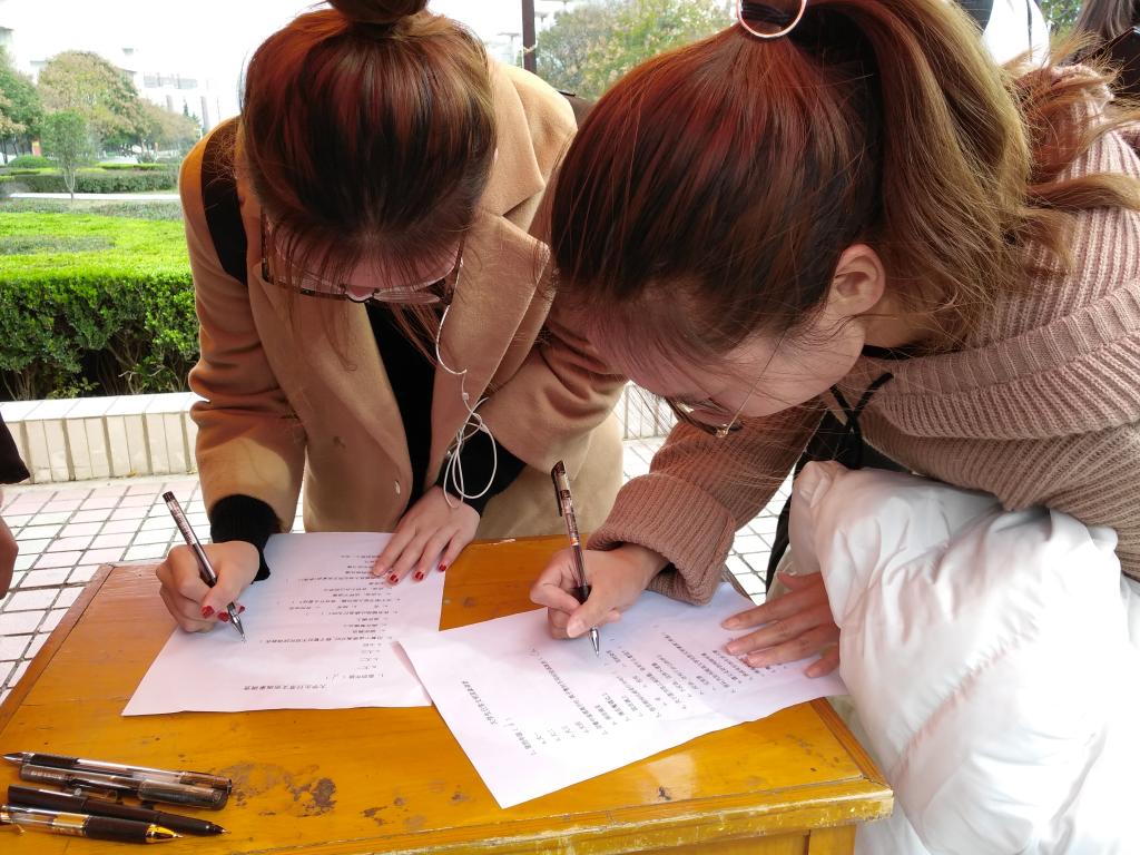 早上八点,志愿者们便早早地到达喷泉广场下的香樟路搭布置活动场所,摆放好桌椅,贴好活动横幅,准备好调查问卷。志愿者们积极地向路过同学宣传本次活动,并耐心地向同学们分发调查问卷,并讲解此次活动。同学们也积极配合,认真填写调查问卷。城建的风虽然大,但是志愿者们为同学们服务的热情之火没有被吹灭。