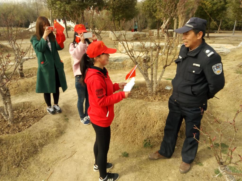 志愿者们于西门出发,因为人数较多,并不选择前往人流密集的市区,而是步行来到了平西湖公园。大家手持小国旗,头戴小红帽,高举青协的旗帜和写有“弘扬雷锋精神,参与志愿服务”的条幅。伴随着《学习雷锋好榜样》的音乐,排列着整齐的队伍。这一形象吸引了在公园漫步的众人好奇的眼光。有了这一良好的开场,志愿者们便选取人流最密集的公园中心开始挂拉条幅,不时便有多人前来看热闹。志愿者们毫不怯场的口述雷锋事迹与雷锋精神,更是分成若干小组向在场群众进行采访,并向路人发放小国旗作为感谢。本次活动中,我们了解到人们对于雷锋精神的认识,群众们也积极得表示将会继续学习雷锋精神,积极投入到志愿服务中来。