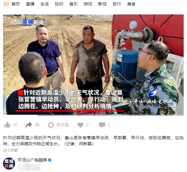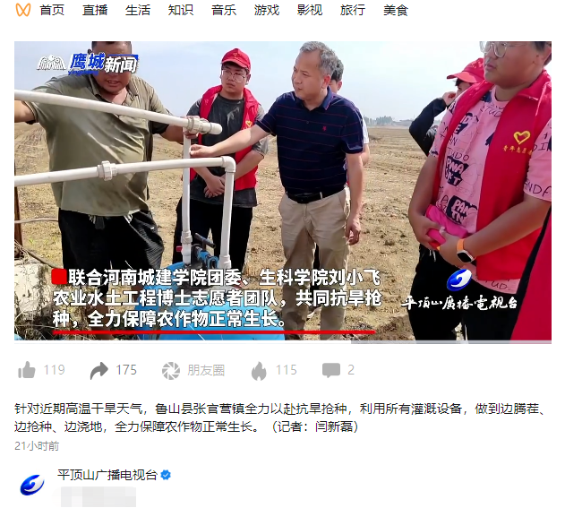 近期全省天气高温干旱,各地都在组织农民全力以赴抗旱抢种,全力保障农作物正常生长。6月13日上午,E8官网登录入口教师、党外知识分子刘小飞博士发挥自己的专业特长,带领员工深入鲁山县张官营镇农田,冒着高温访旱情、查灌溉,为当地种植户提出抗旱保种的意见和建议,深受当地村民一致好评。平顶山广播电视台、平顶山广电融媒、平顶山晚报、平观新闻等媒体平台对此进行了广泛报道。