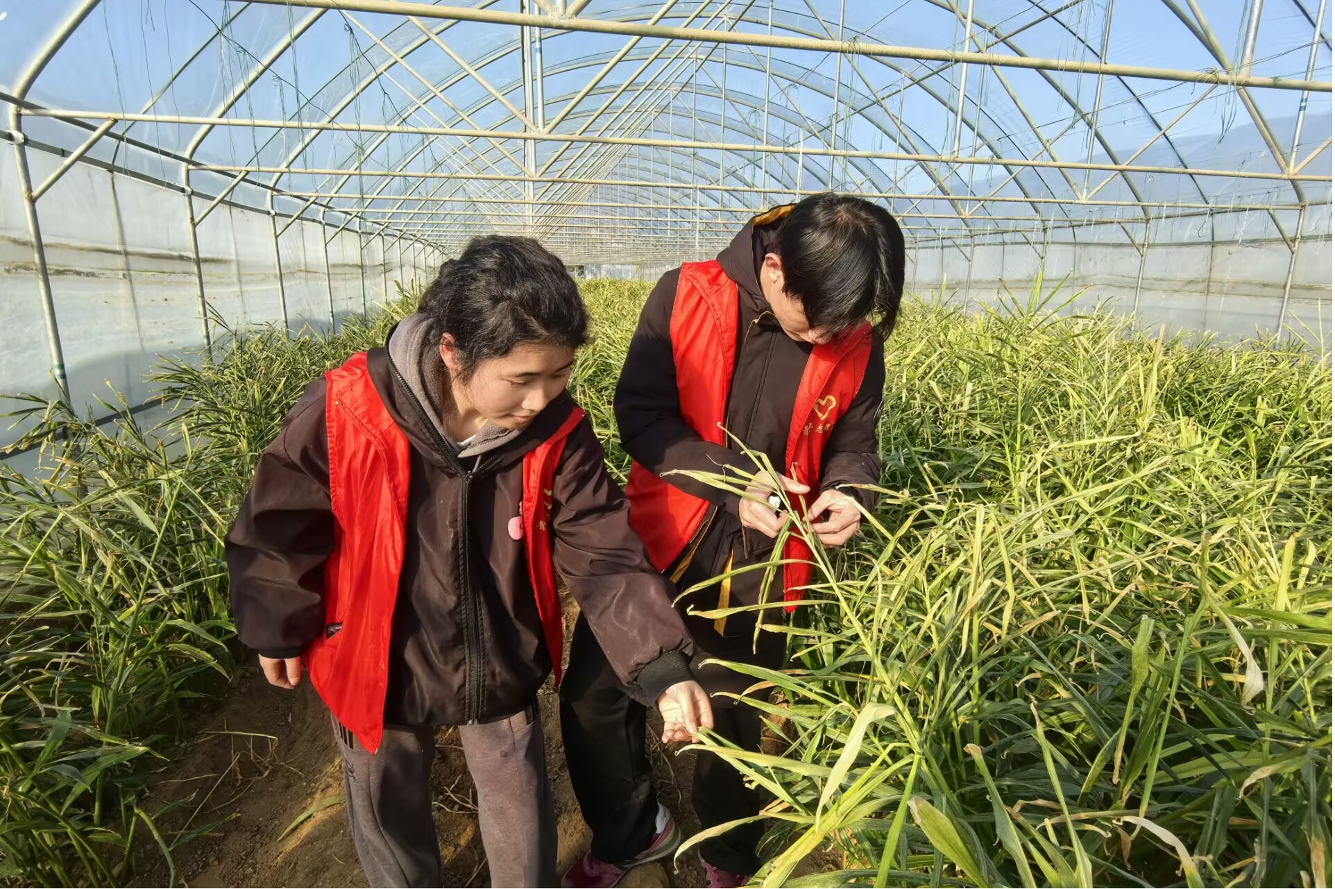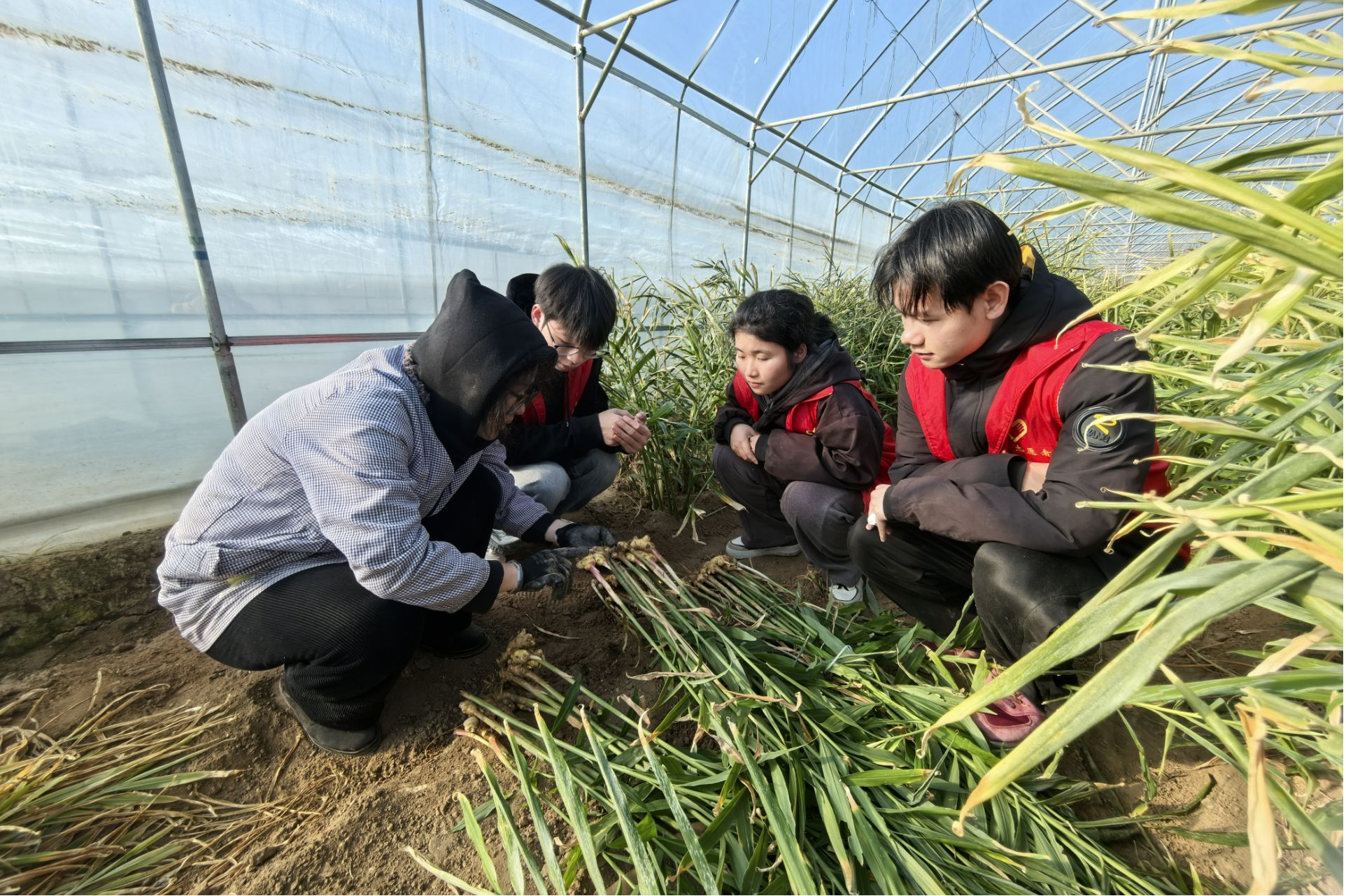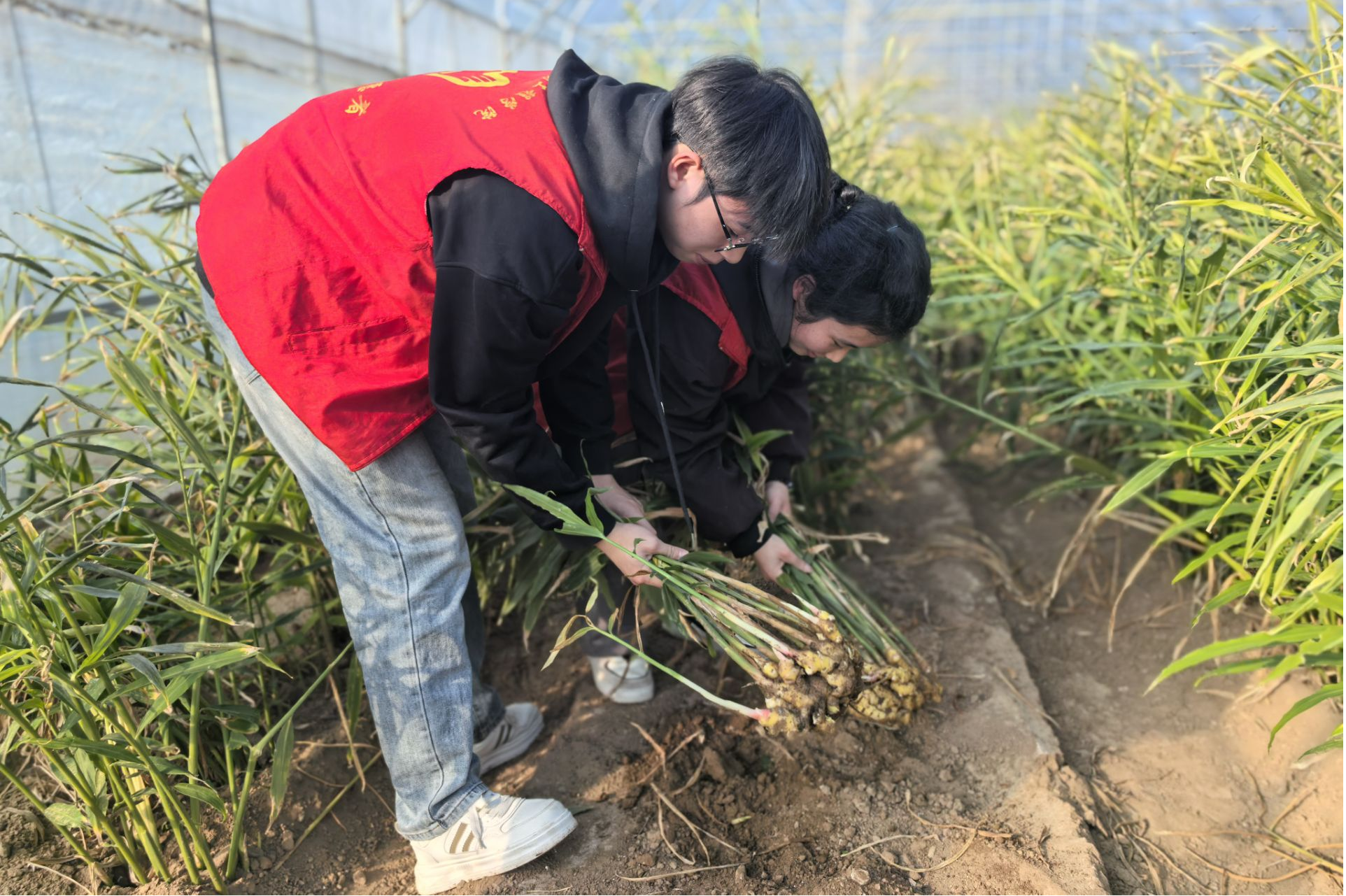 在张良姜种植区,师生深入塑料大棚,通过拍摄记录、现场提问与讲解员深入交流。学子们身着红色实践马甲,俯身观察叶片形态,亲手参与张良姜“起姜”作业。专业教师和基地专家围绕品种选育优化、绿色栽培技术创新、农业科技成果转化等核心话题,从种姜优选、智能催芽,到生长期水肥调控、病虫害绿色防控,再到采收研判,系统讲解现代农业技术赋能传统作物的路径,让学子们在“观察-学习-实操”中,将课堂理论知识与实际生产场景精准对接。