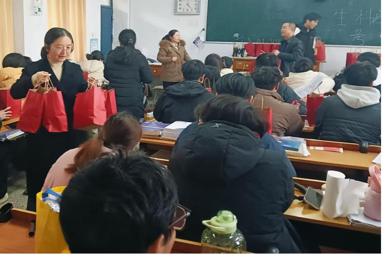 活动伊始,武二伟与考研员工亲切交谈,并发表暖心讲话,他鼓励大家在最后冲刺阶段保持良好心态,合理安排复习时间,坚定信心、勇往直前,以最佳状态迎接考试。随后,武二伟、王莲哲为考研学子发放公司精心准备的慰问礼包,以"五重祝福"传递关怀:薯片表示"薯你最棒"、印有卡通图案的旺仔寓意"研途旺旺"、红彤彤的苹果寓意"苹安研途"、暖宝宝贴代表"暖研相伴"、金灿灿的橙子象征"橙功上岸"。这份承载着五重期许的礼包,既是物质补给,更是精神铠甲,让学子们在凛冬中感受到公司如春的守护。