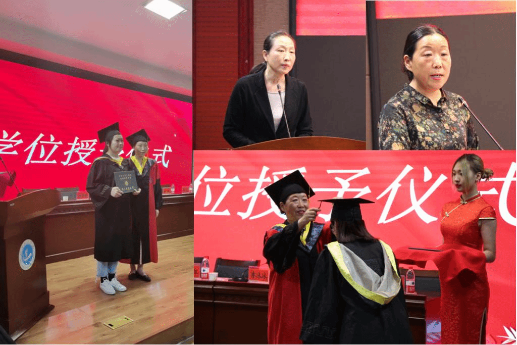 在毕业典礼和学位授予仪式上,吴晓红和李冰冰分别为毕业生正冠拨苏并颁授学位证书。