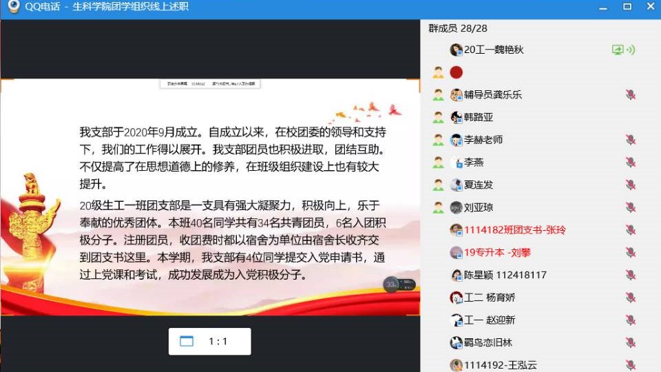 会议期间21个团支书运用PPT形式依次进行了工作汇报分享,分别从团支部工作、青年大学习、老员工社会实践活动等方面对2020年全年重点工作开展情况、工作成效以及特点亮点进行总结展示。最后由李赫做总结,对于未来的工作他提出了相应的规划,点出各个团支部工作中存在的问题与不足,表示各个团支部要优化内部结构,结合各班特色,发展团组织特色,提升实际创新水平。他进一步明确了2021年团支部工作的目标及努力方向,希望全院各级团干部齐心协力,推动各项工作更上一层楼。